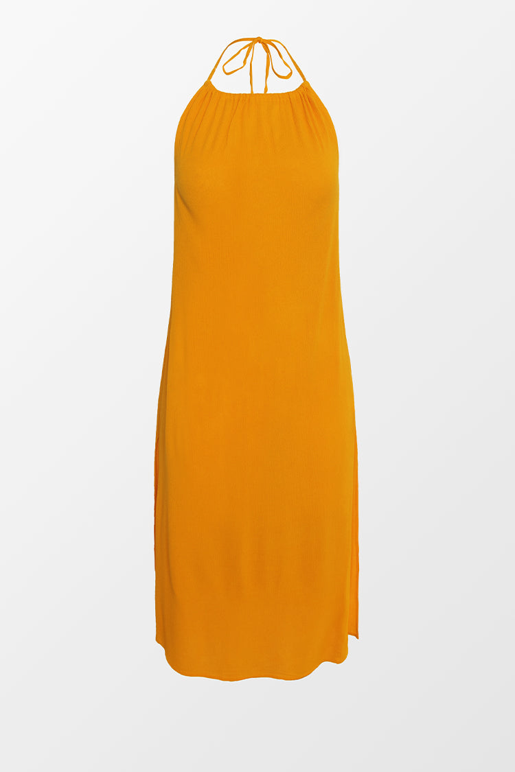 You'll be a thing of beauty and joy forever in the Haleigh Orange Backless Split Tea Length Dress! Stunning Orange gives a vibe of energy. Drawstring halter detail falls to fitted waist and ends in a split tea length dress.