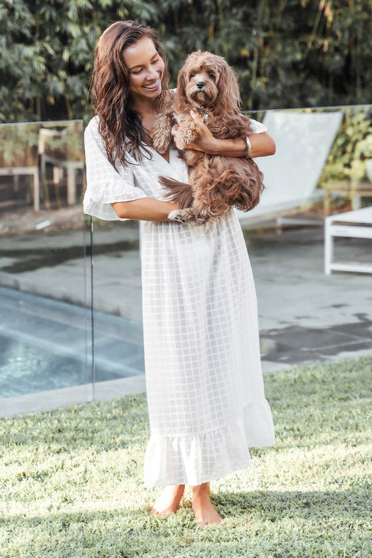 Our Fitted Waisted Ruffle Cover-up Dress makes a great pool and beachwear cover up. Features drop shoulder sleeve detailing and v-neckline.