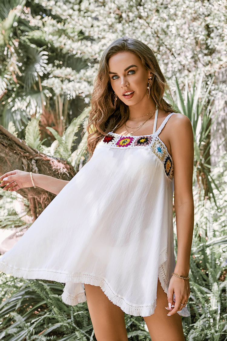 Add this season’s must-have shade to your look with this Irregular Hem Crochet Tassel Cover-up Dress. Featuring an eye-catching boho print with crochet detailing, thin straps, and irregular hem with tassels.