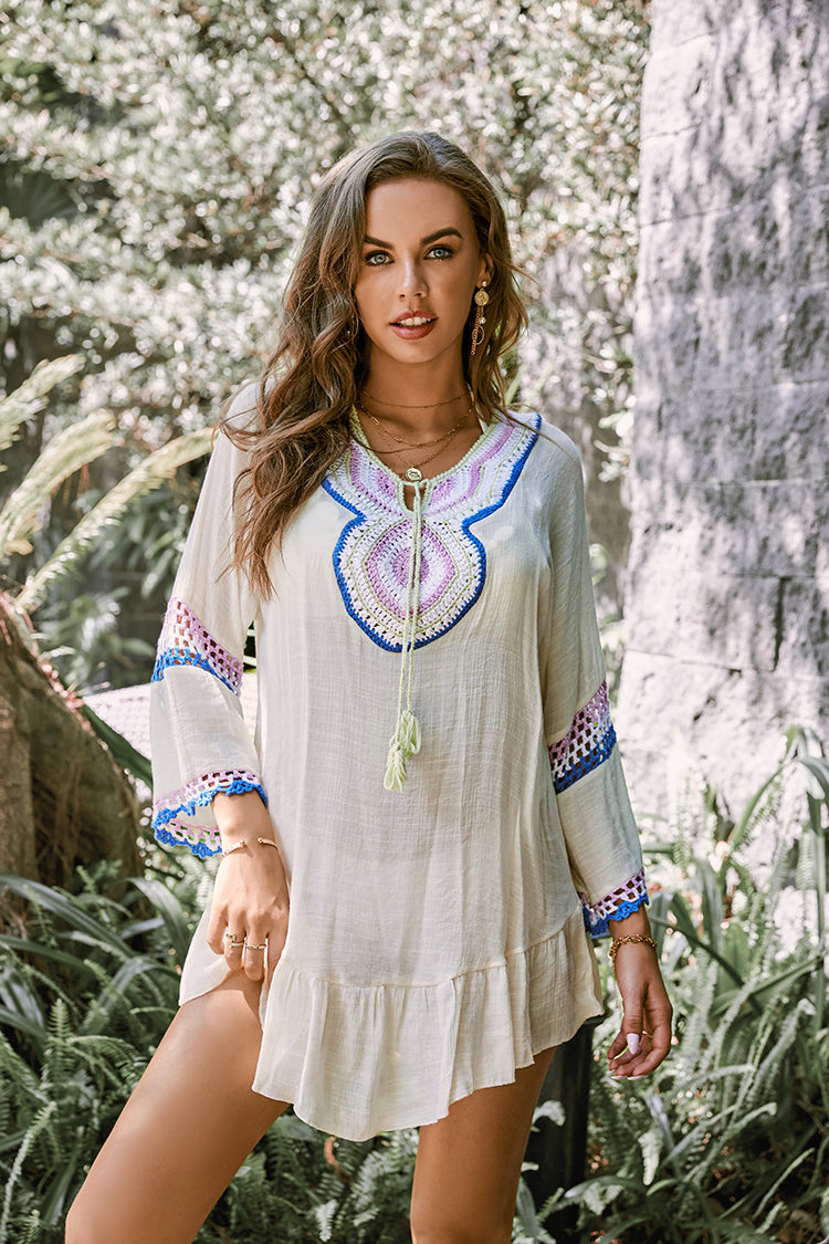 Our Cover-up features irregular hem and fringe design. Wear the Valda Scoop Crochet Short Cover Up over your favorite swimsuit. You must need such a cover up when you travel.