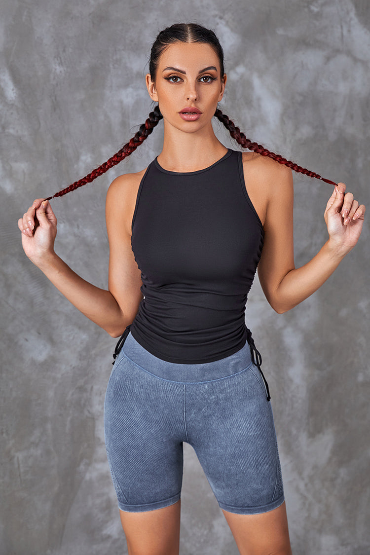 Living a stylish stay-at-home life with our Essentials Black Round Neck Ruched Sleeveless Sweatshirt. Featuring a round neckline and drawstrings on both side. Pair it with any of your leggings for a sports look!