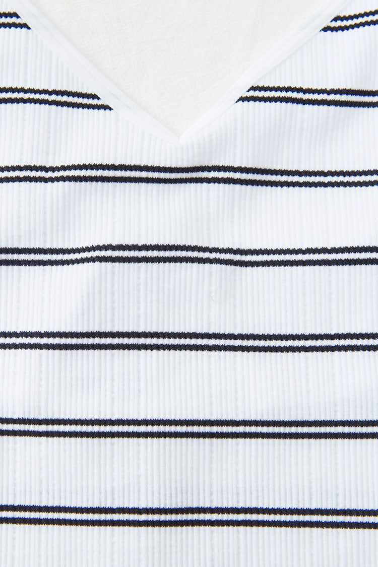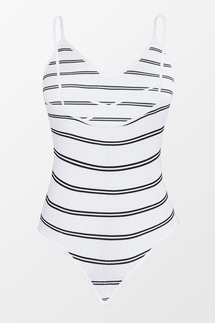 Bring sexy vibes in our Estelle Striped Rib Bodysuit. Featuring striped rib material and crisscross back to keep you looking cool and sexy. Wear with comfy bottoms to complete the look.