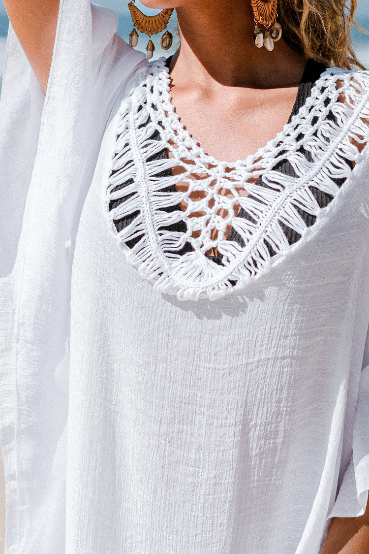 The sleeves of this Sophia White Square Neck Crochet Tassel Kaftan are very wide and easy to wear. The Sophia White Square Neck Crochet Tassel Kaftan will add comfort to your seaside trip.