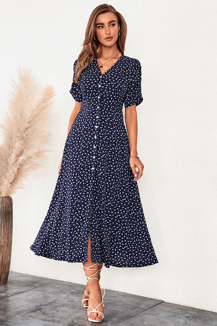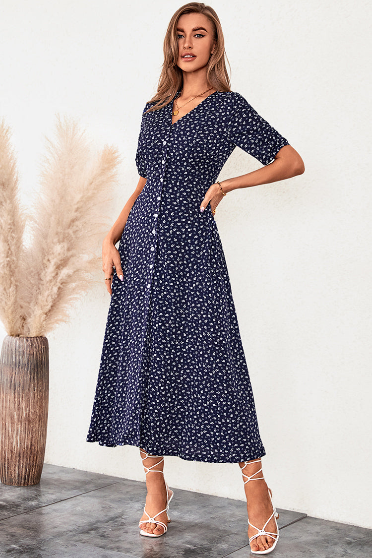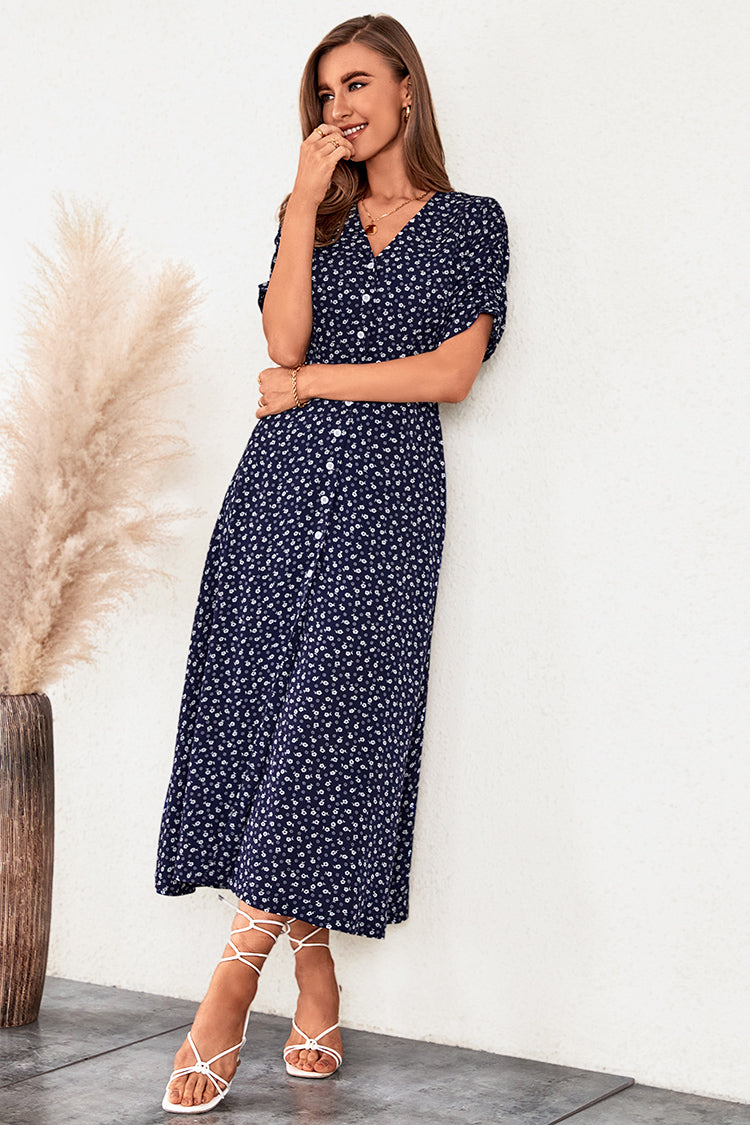 Upgrade your dress collection with this Button Ditsy Ruching A-Shape Dress. Featuring buttons front, ruching design with half sleeves and a fitted waist.