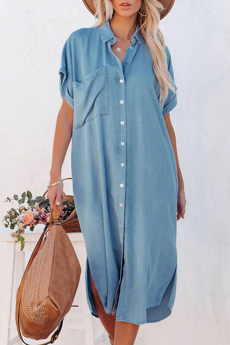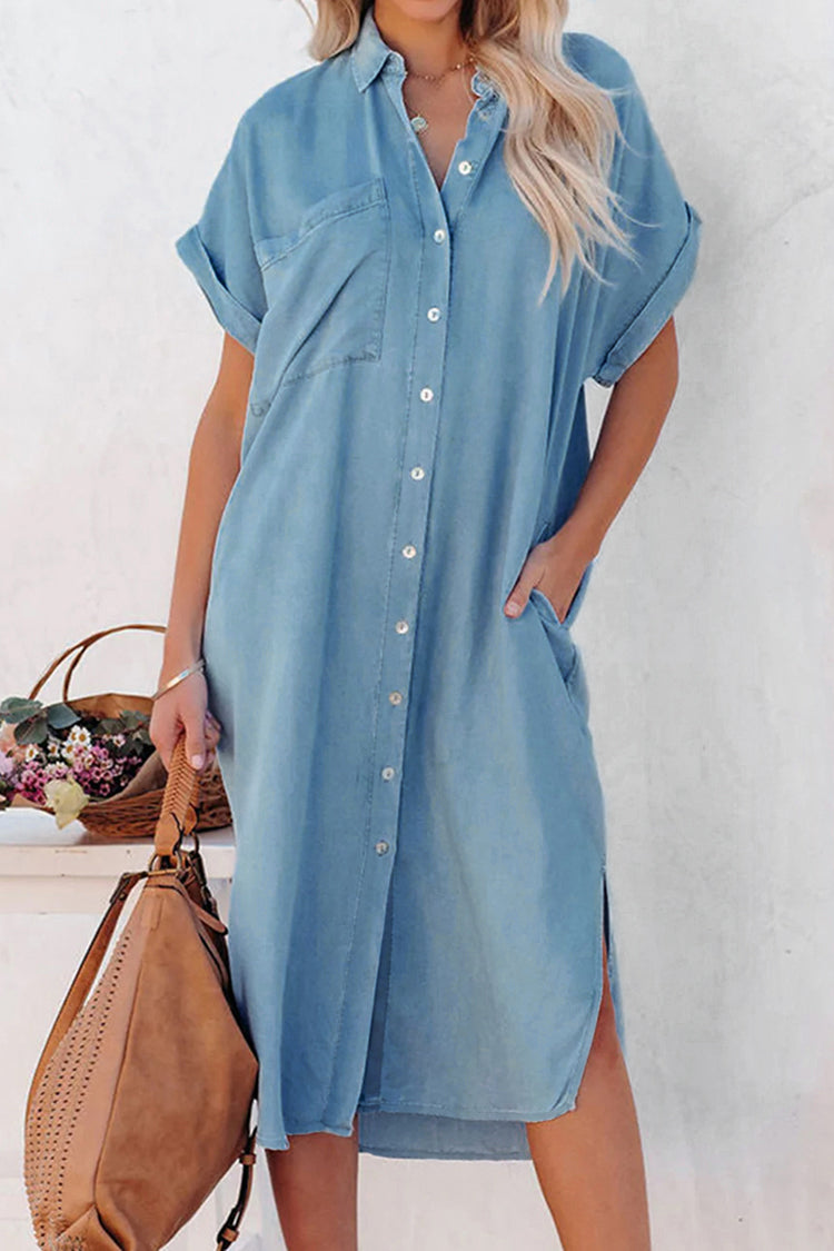 Perfect for everyday commuting, our Shirt Collar Bell Sleeve Button Dress has a loose, comfortable fit that will keep you cozy throughout the day.