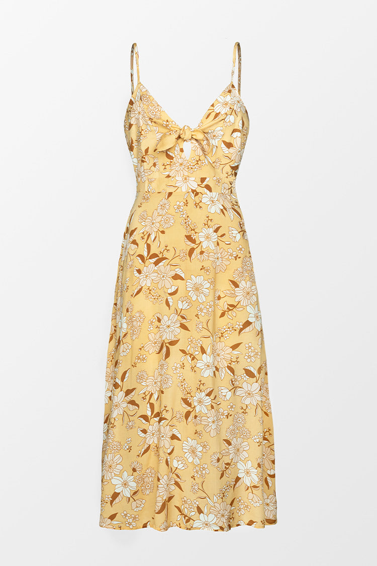 Nothing says Summer like Bryanna Floral Cut Out Tie Dress. A classic floral print in white and brown details the yellow pair to elevate the look! Featuring zip on the back and adjustable straps. Cut out and bow tie detail add a hint of cuteness.