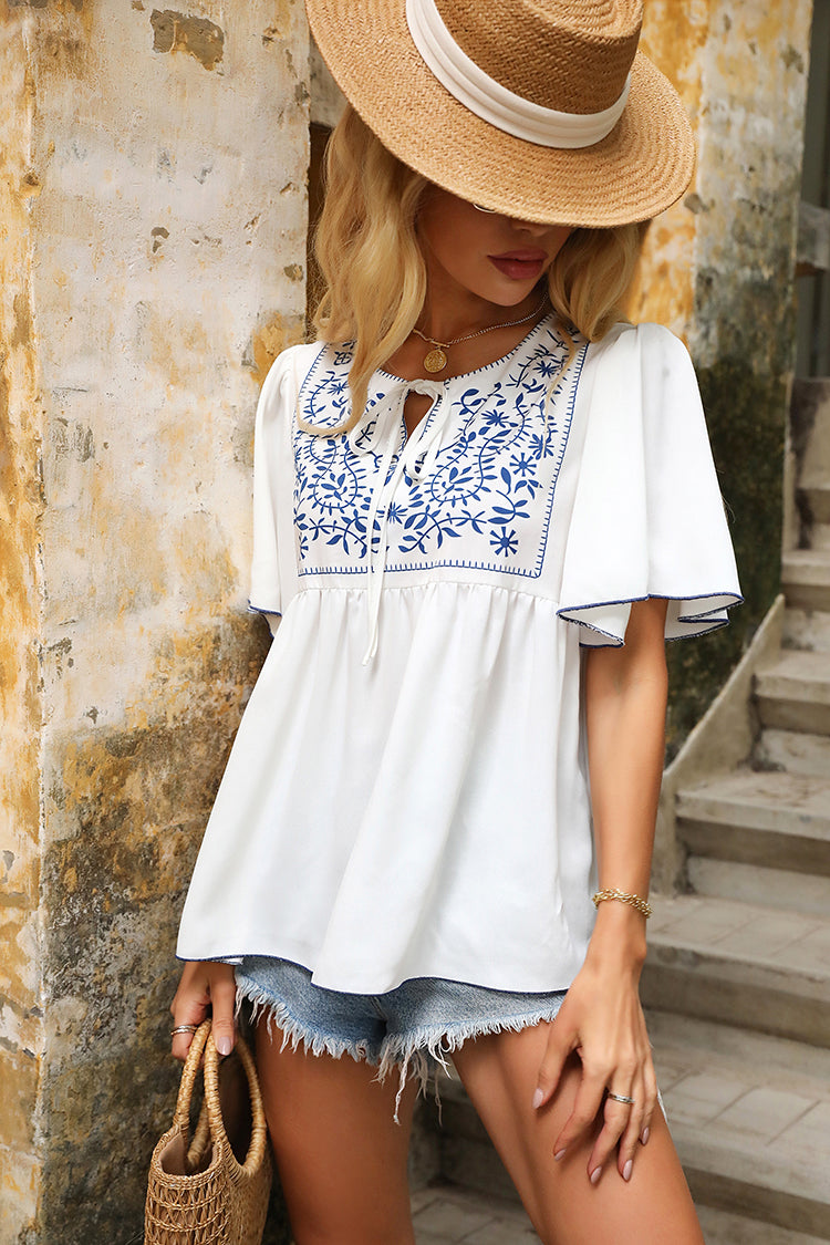 We are loving this Round Neck Half Sleeves Top for your new season wardrobe. Featuring a round neckline and loose waist. The front leaf pattern adds another flavor.