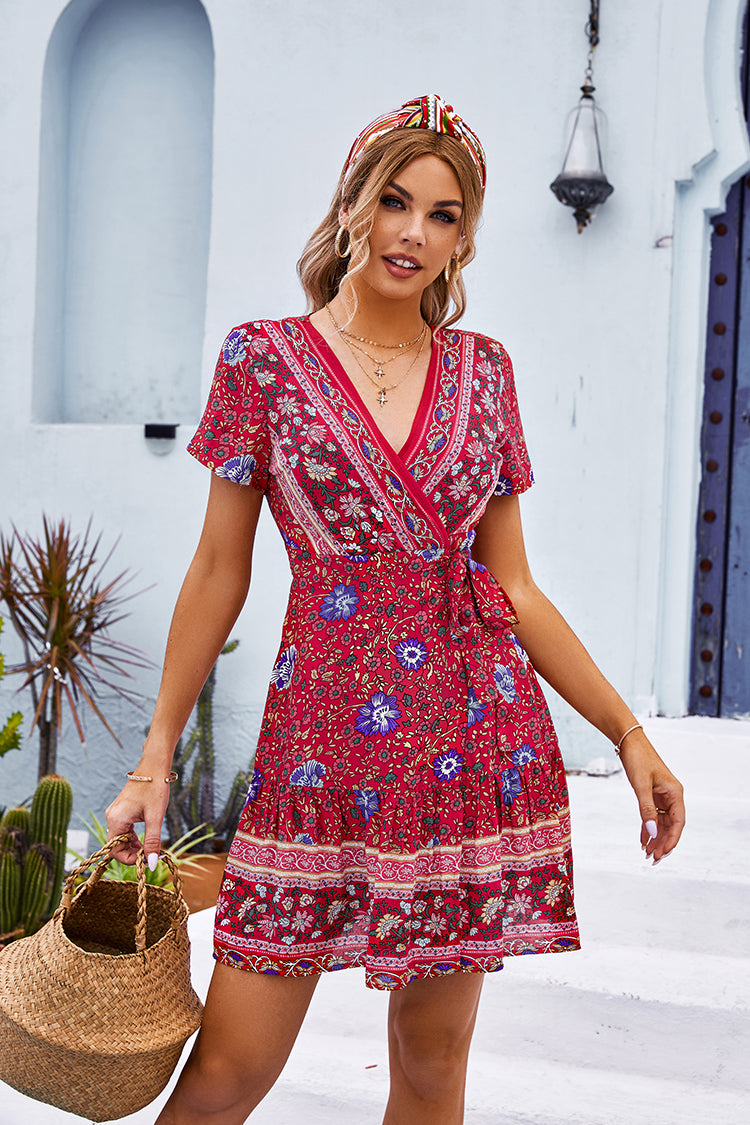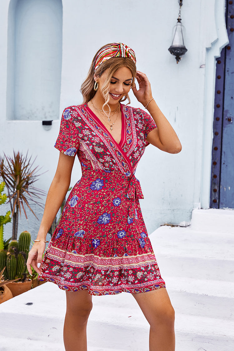 Doreen V-neck Ethnic Print A-Shape Dress features with tie waist and ethnic print. You can pair it with some strappy sandals and simple accessories to complete the look.