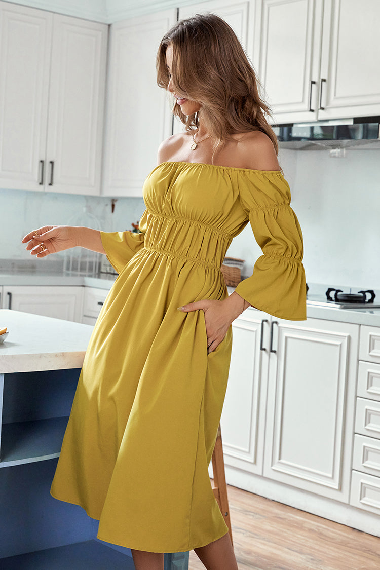 Get ready for your next vacay with Elva Off-shoulder Ruffle A-Shape Dress. This dress features off-shoulder sleeve and ruffle design. Elastic waist detail for the perfect fit.