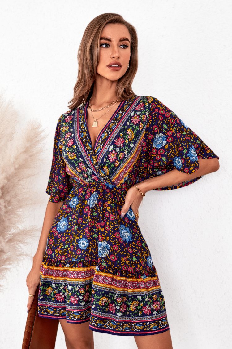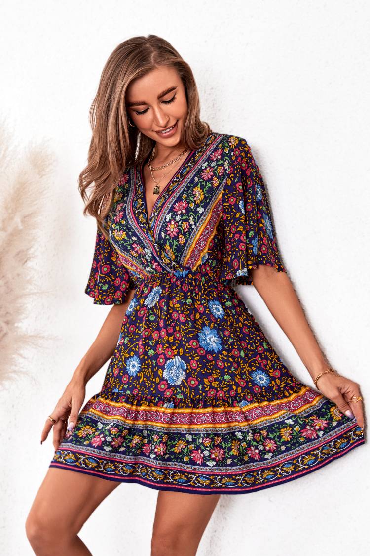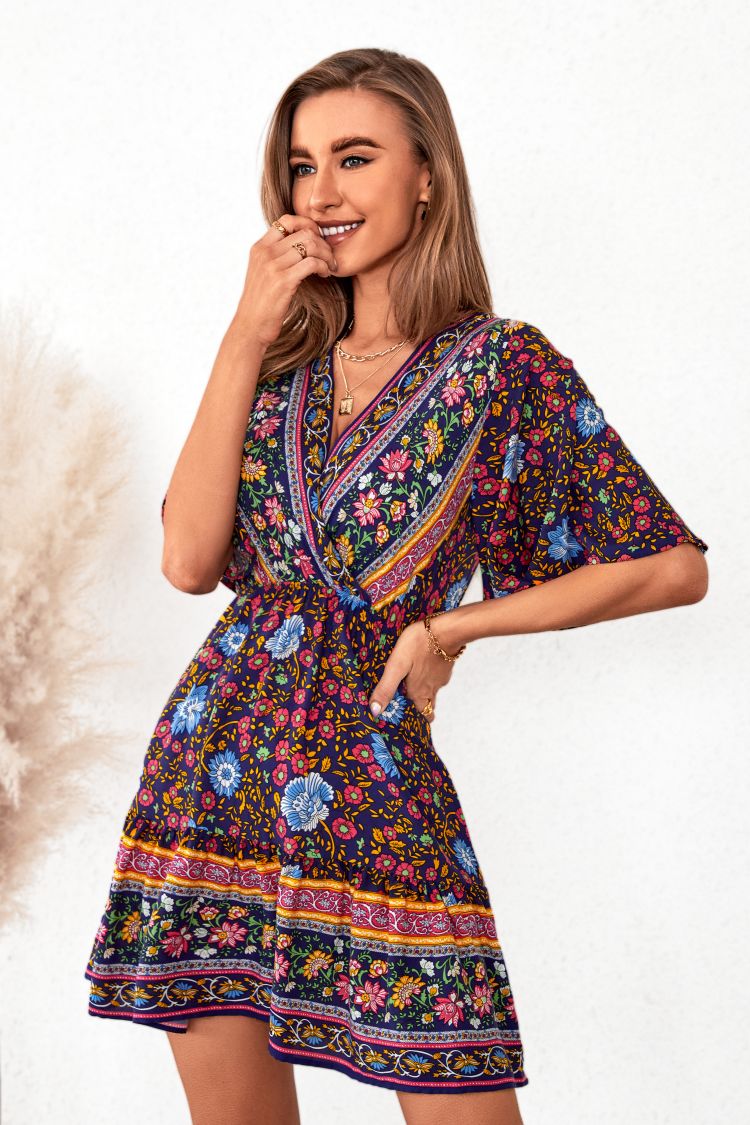 This V-neck Tie Waist Ruffle Wrap Dress features ethnic print, wearing it you will definitely become the most attractive person in the crowd.