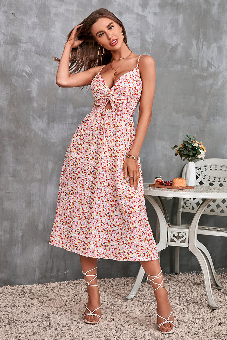This Ruching Cutout Ditsy Slip Dress is a versatile dress. Looks great with sandals and a long necklace to give you a stylish look.