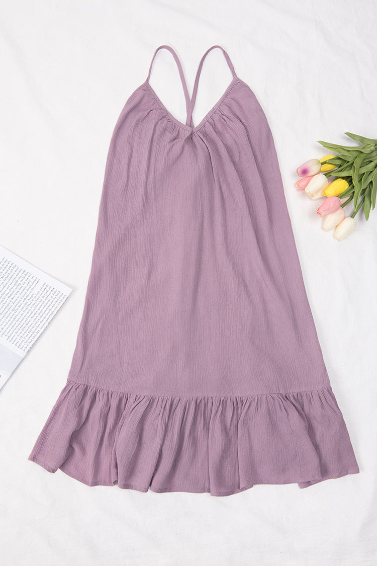 Our Louise V-neck Backless Ruched Slip Dress will refresh your swimwear collection. Features with v-neckline and thin crisscross back tie straps, ruched and backless detail add a touch of sexy.
