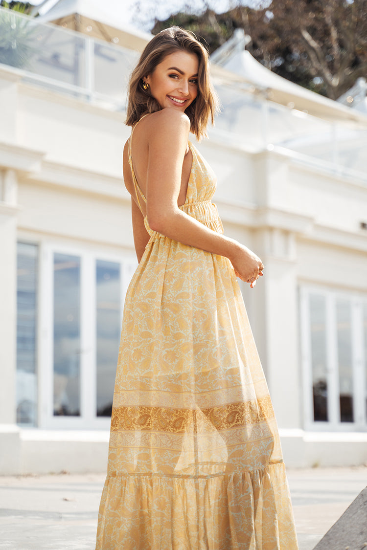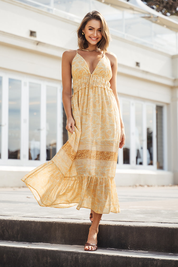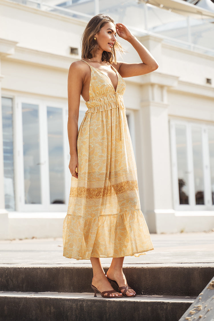 Don't miss our Madalynn Frill Backless Plunge Slip Dress on vacation. Featuring ruching design and paisley pattern. Wear this dress with strappy heels for a look we love.