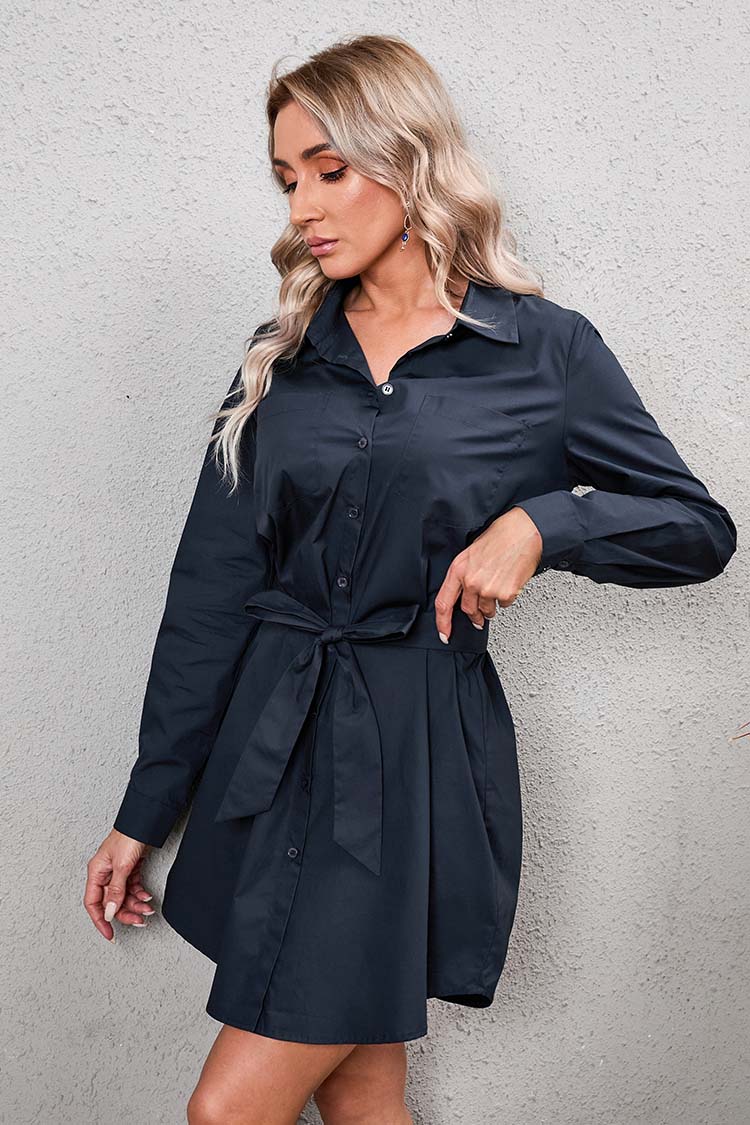 Nya Shirt-collar Belted Dress is a bussiness style cloth, the shirt collar, the botton and the belted design can reflects you professional and elite quality entirely.