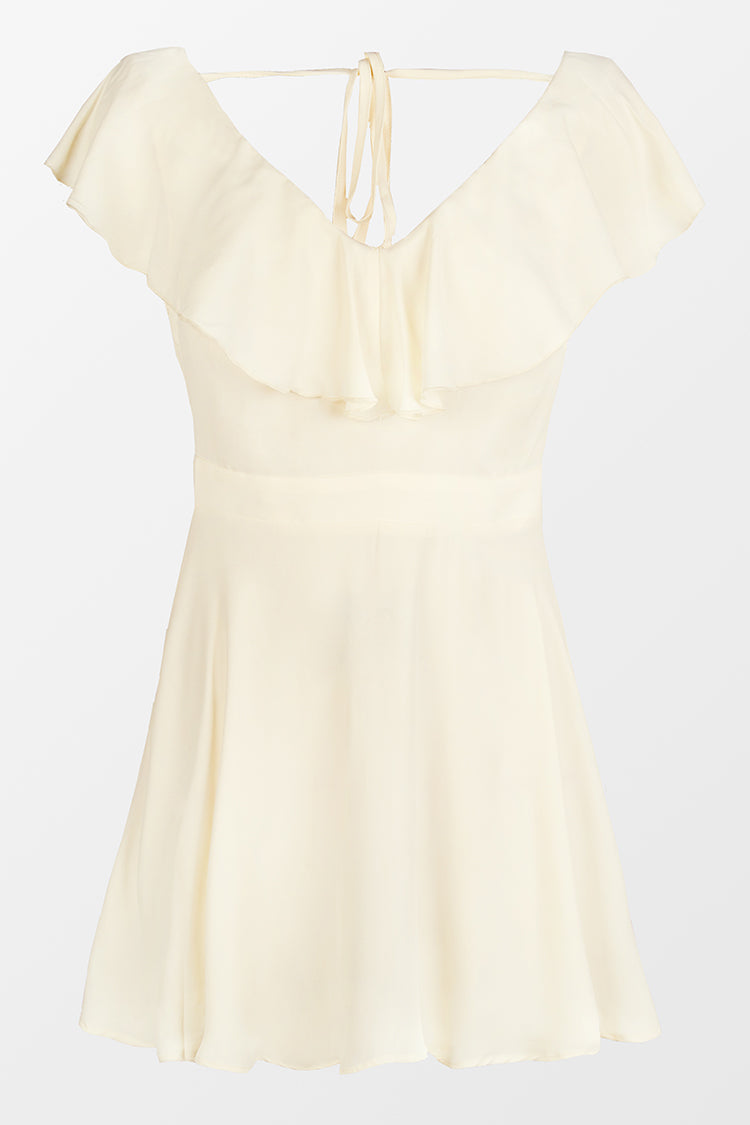 Raelynn V-neck Ruffle Mini Dress is a major stunner. Features with v-neckline decorated with ruffles on the edge. Back zipper for easy wear. Pair it with wide brimmed straw hats.