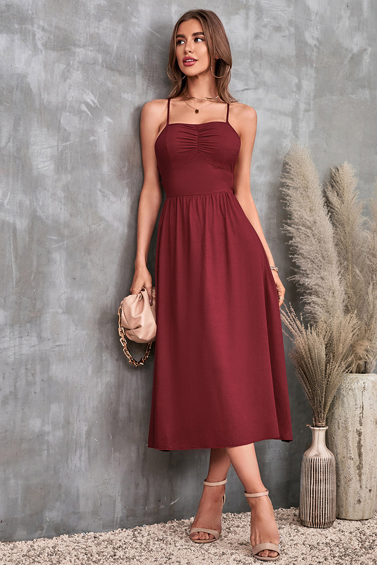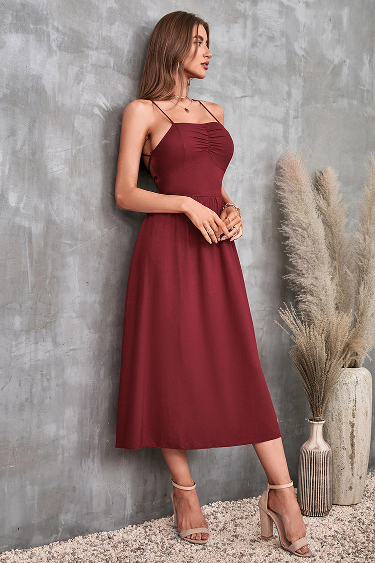Add some chic feminine feels to your new season edit with this Backless Drawstring Thin Straps Slip Dress. Featuring thin straps, ruched detailing, an open back with a tying sash.