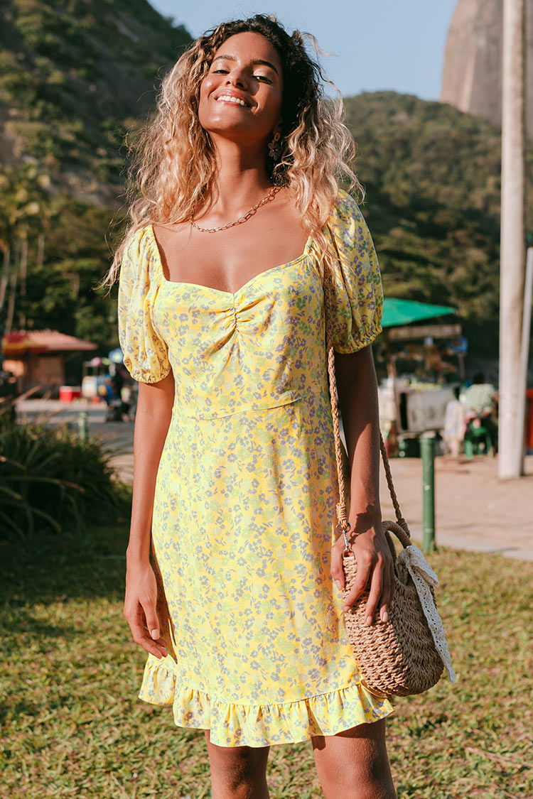 Alianna Yellow Ditsy Puff Sleeve Dress