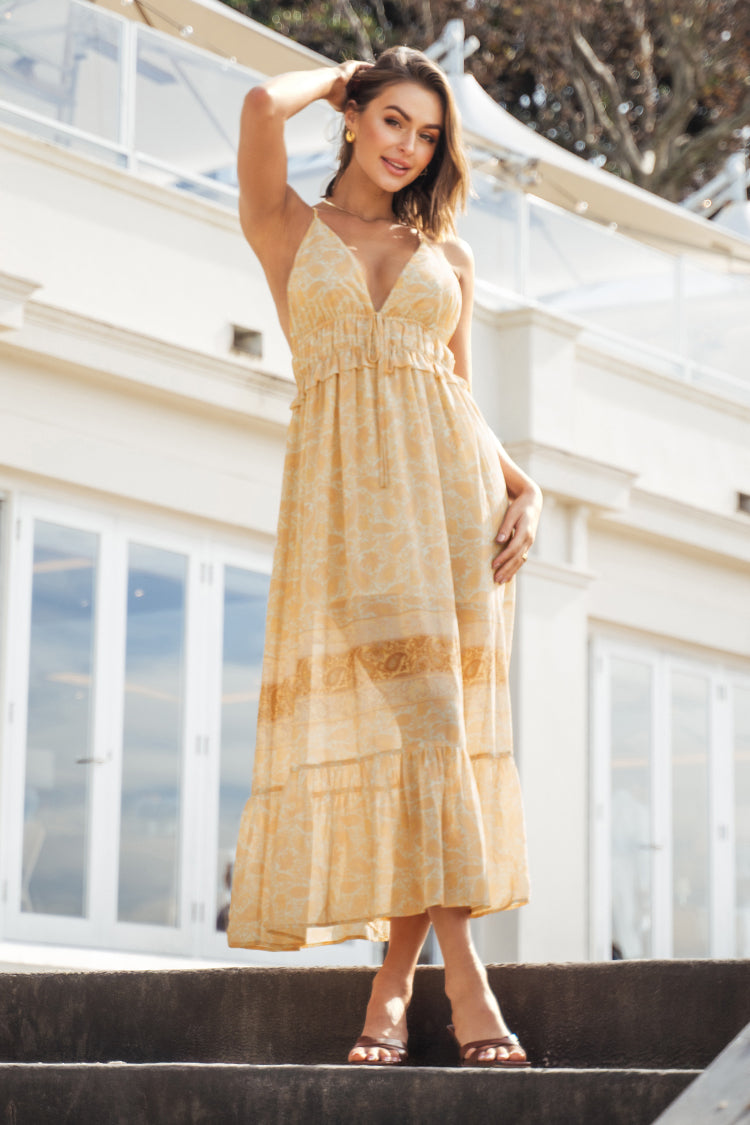 Kaci Yellow Scoop Back Tie Long Sleeve Dress