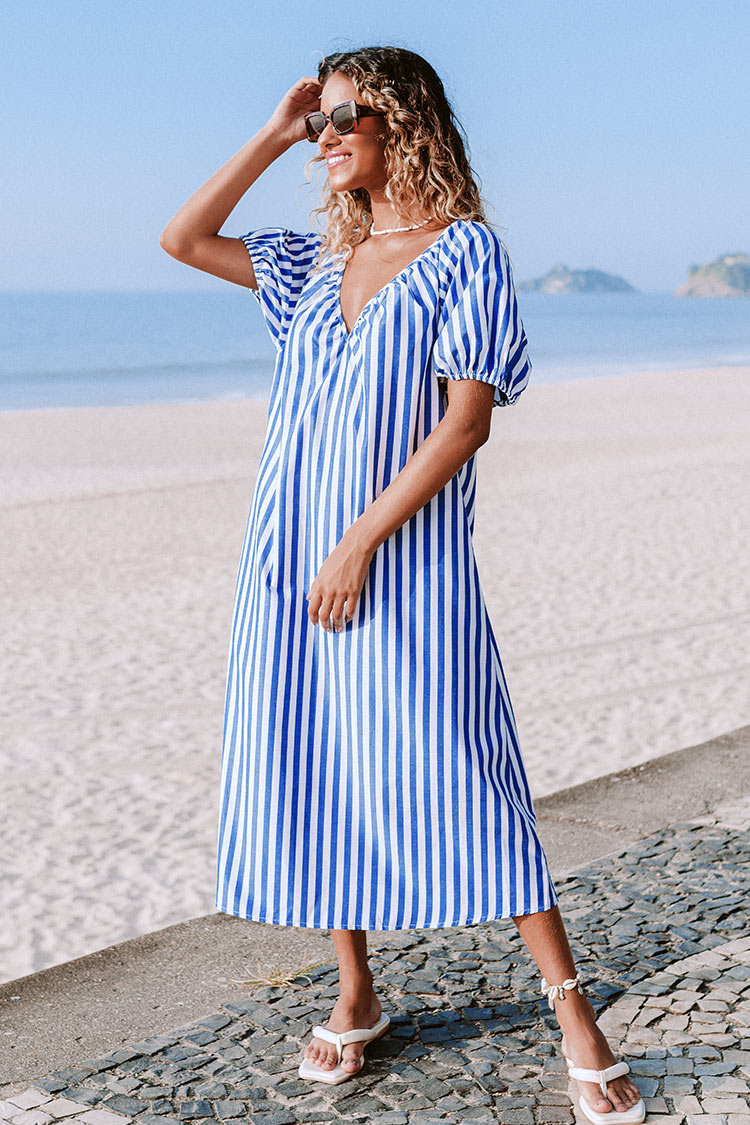 Cable Beach V-neck Bubble Sleeve Smocking A-Shape Dress