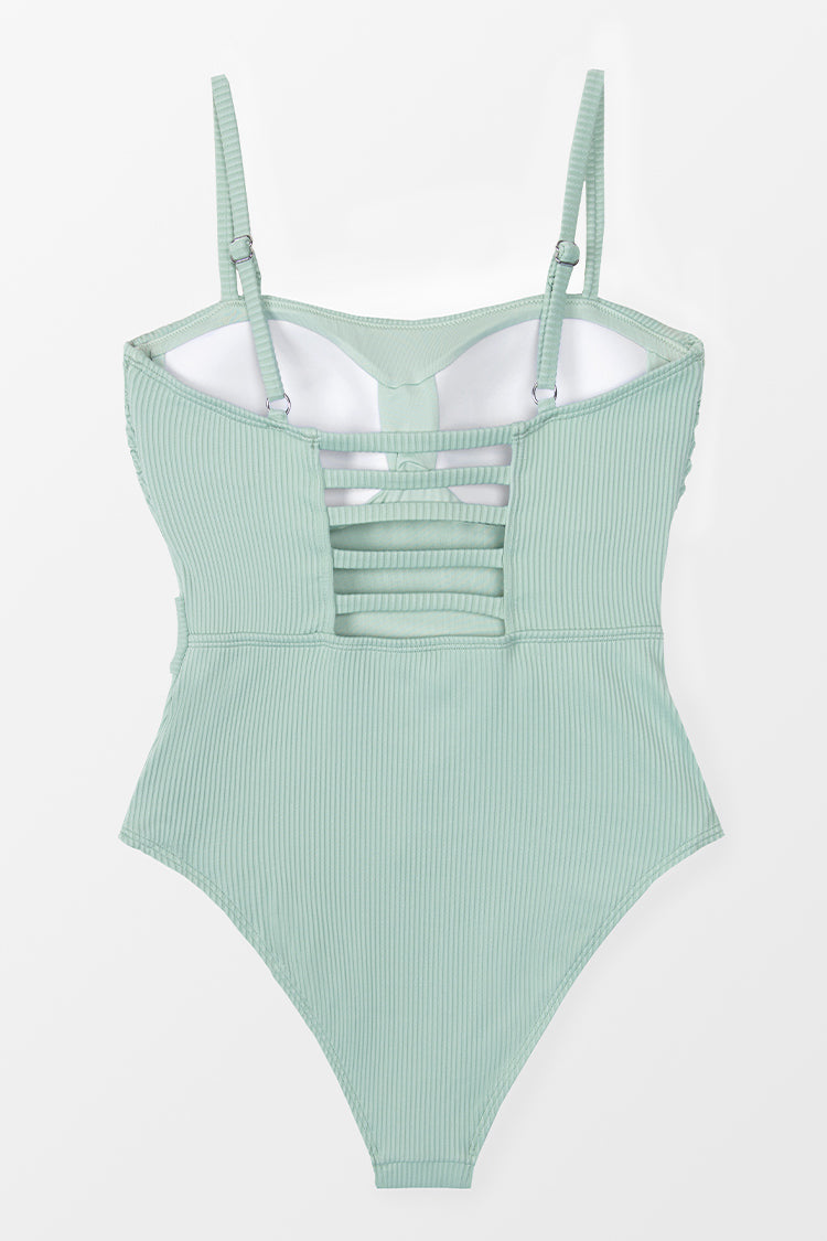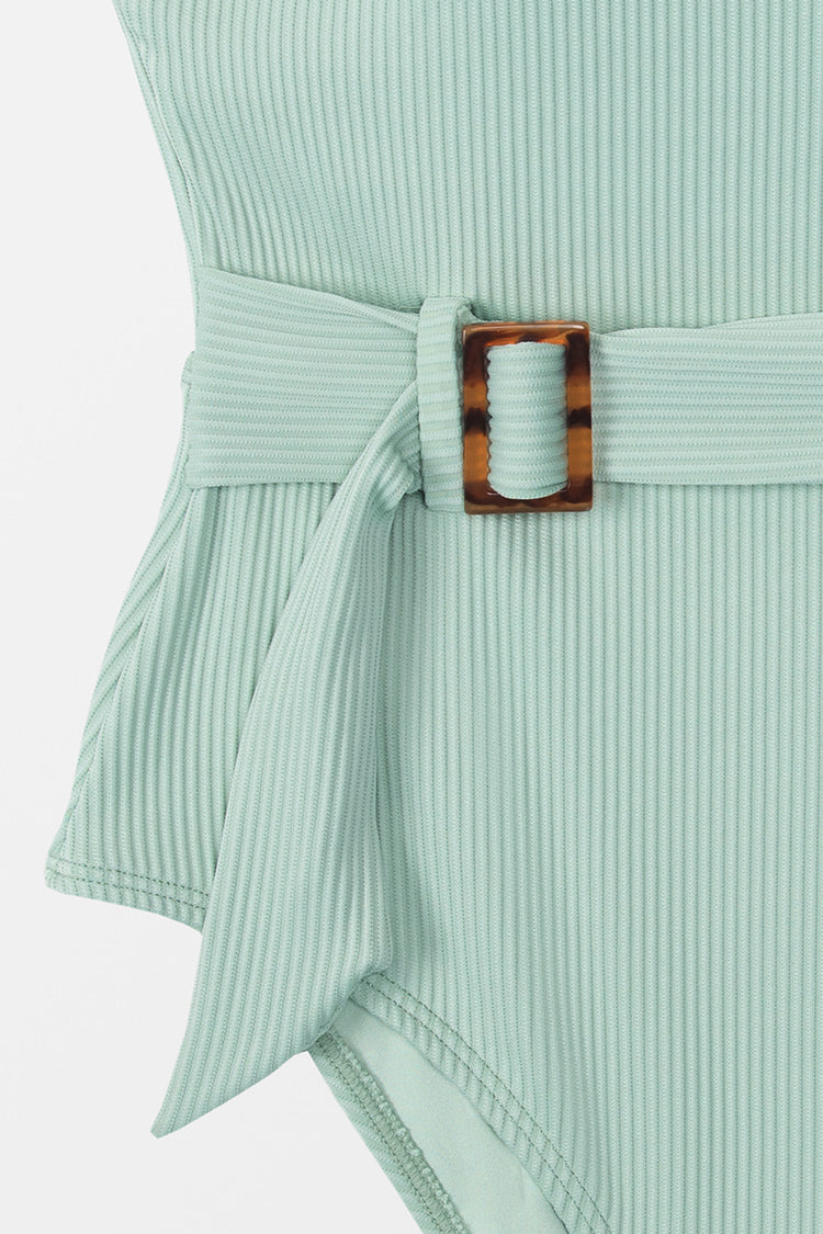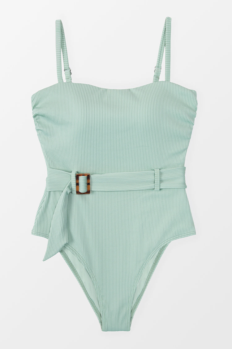 Anahi Green Square Neck Belted One Piece Swimsuit will refresh your swimwear collection. Features with square neckline on the front and strappy detail on the back. There's a belt on the waist for decoration.