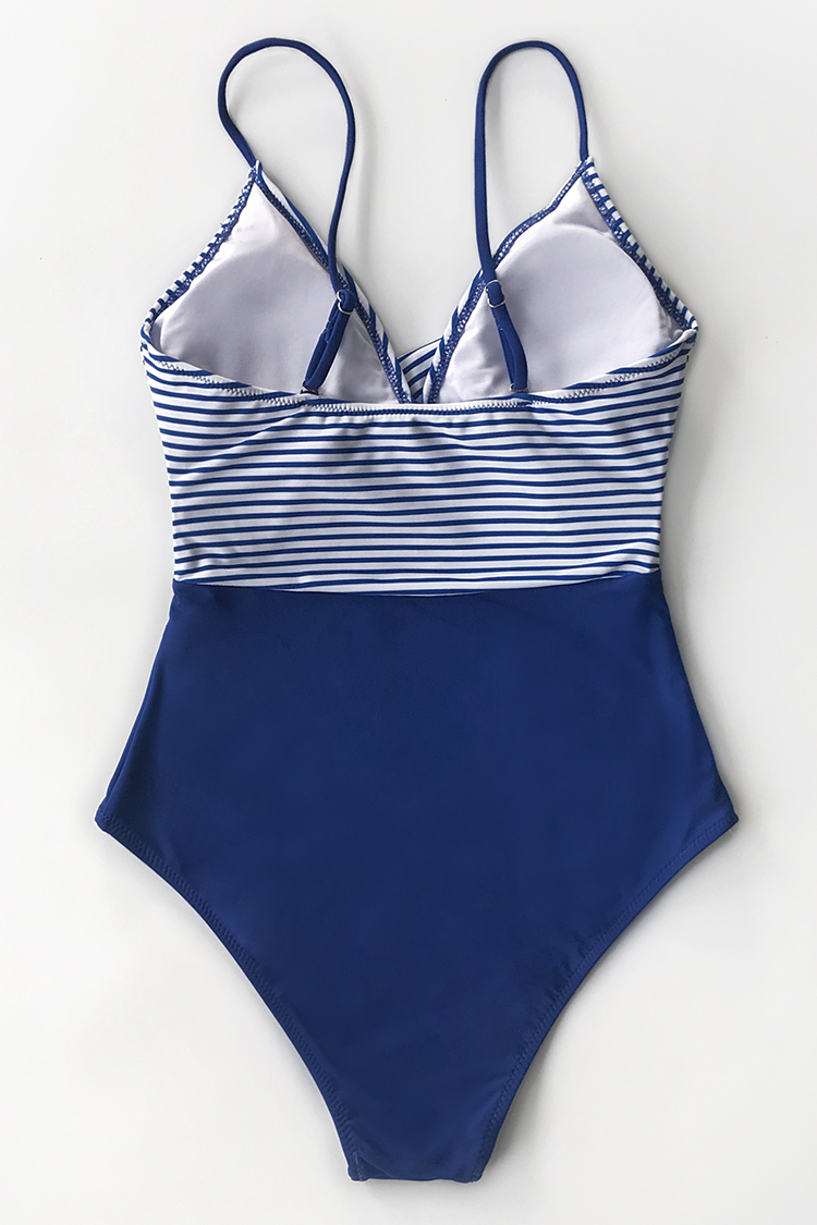 A classic natutical-inspired maillot, the Blue and Stripe One Piece Swimsuit will never go out of style. Detailed with a v-neck and padded cups, it's design to fit and flatter your curves so you can catch waves with confidence.