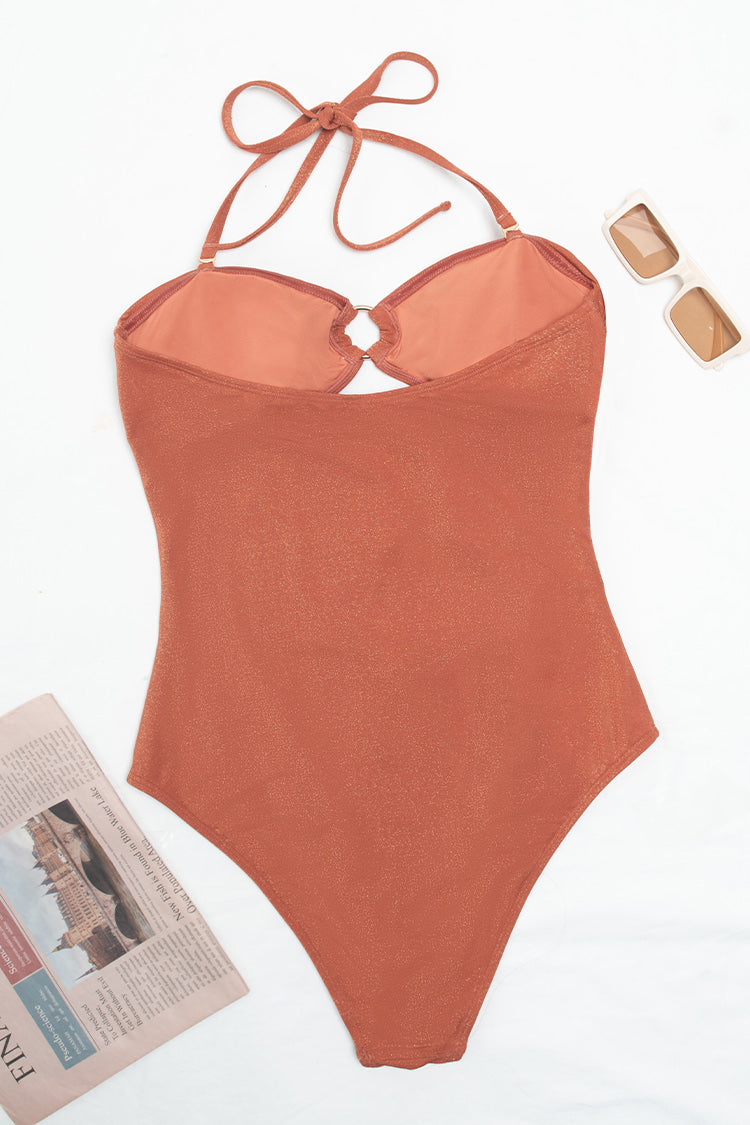 Make a bold statement with our Brook O-ring Halter Cut-out One Piece Swimsuit. This flirty one-piece features halter design with o-ring and cut-out front. It's the perfect one piece for the summer.