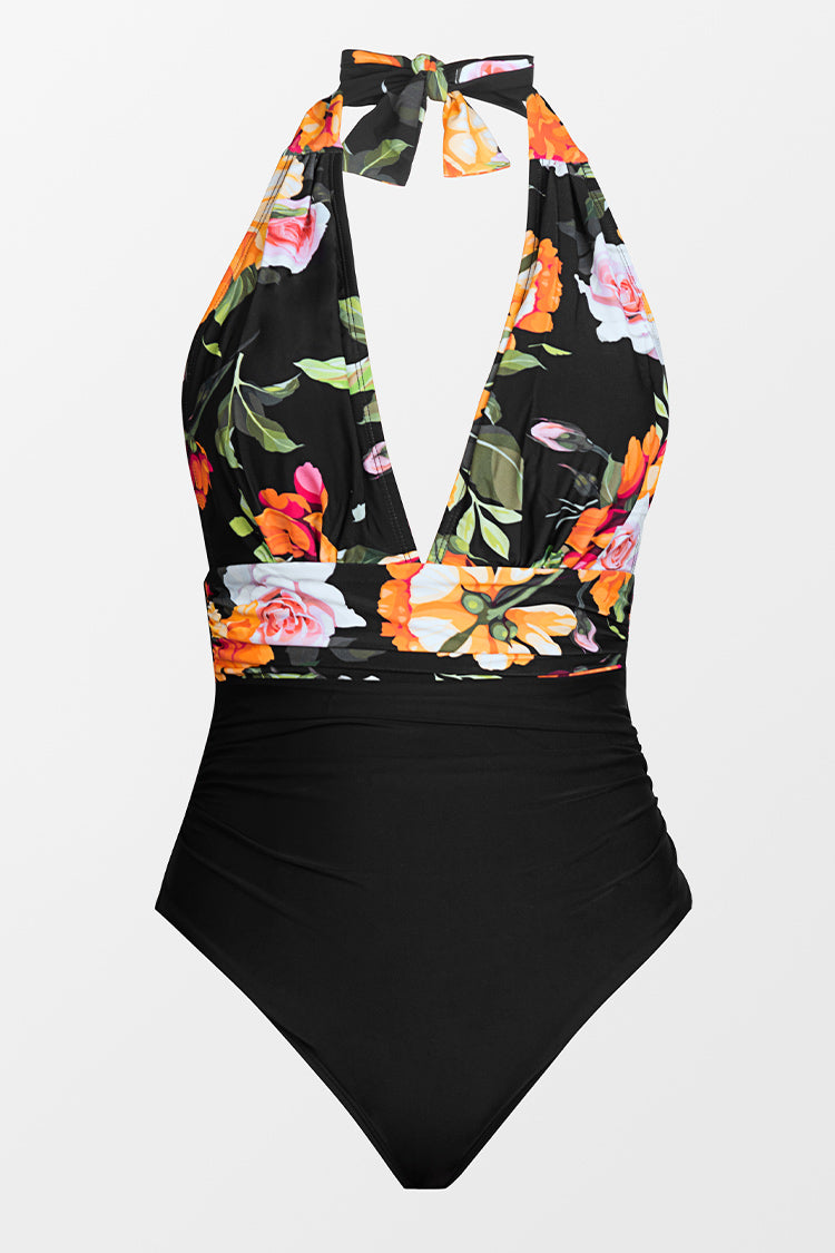 Our Floral and Black Plunge Halter One-Piece Swimsuit looks great on every body! This bathing suit features a deep v-neck, ruching at the bust and padded cups for added support.
