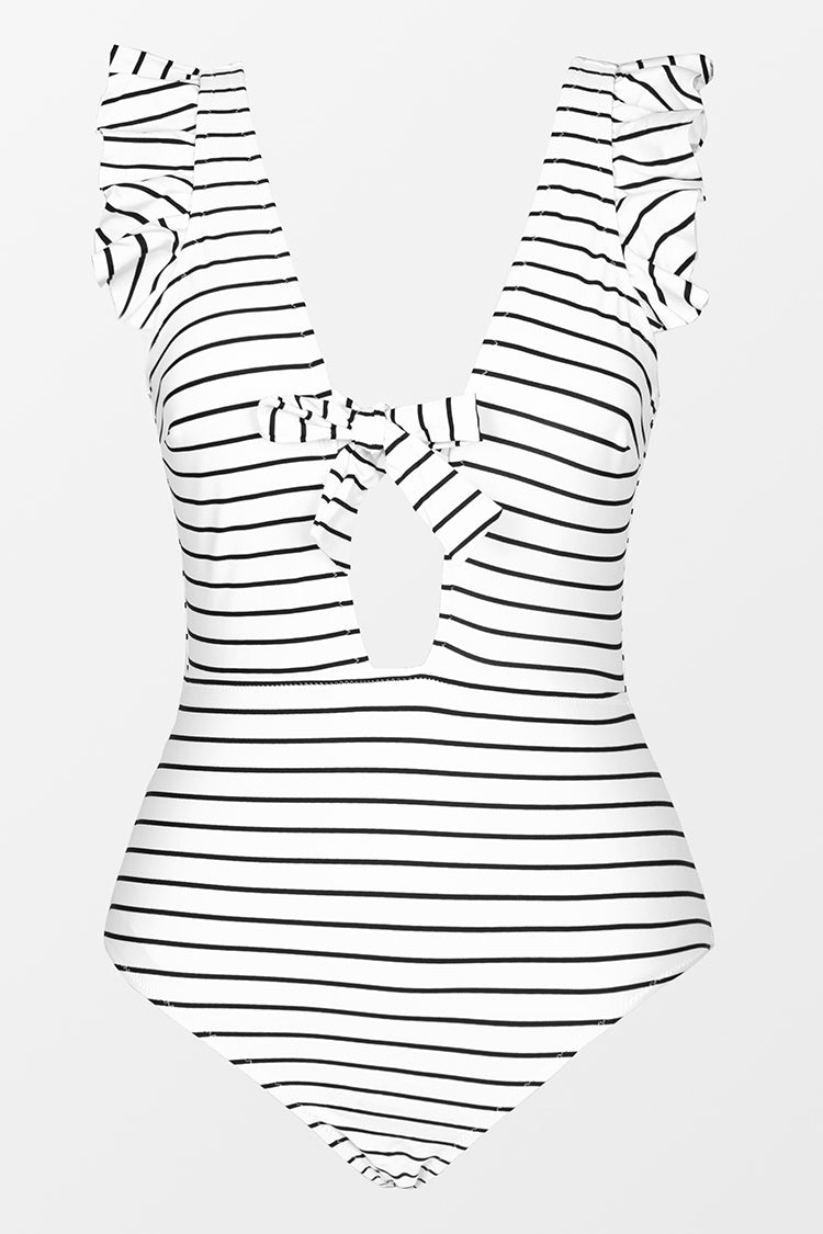 Soak up the sun in this White and Black Stripe Ruffle One-Piece Swimsuit. Features deep v-neck with knotted front details and ruffle on the shoulder. Perfect for a day of lounging by the pool!